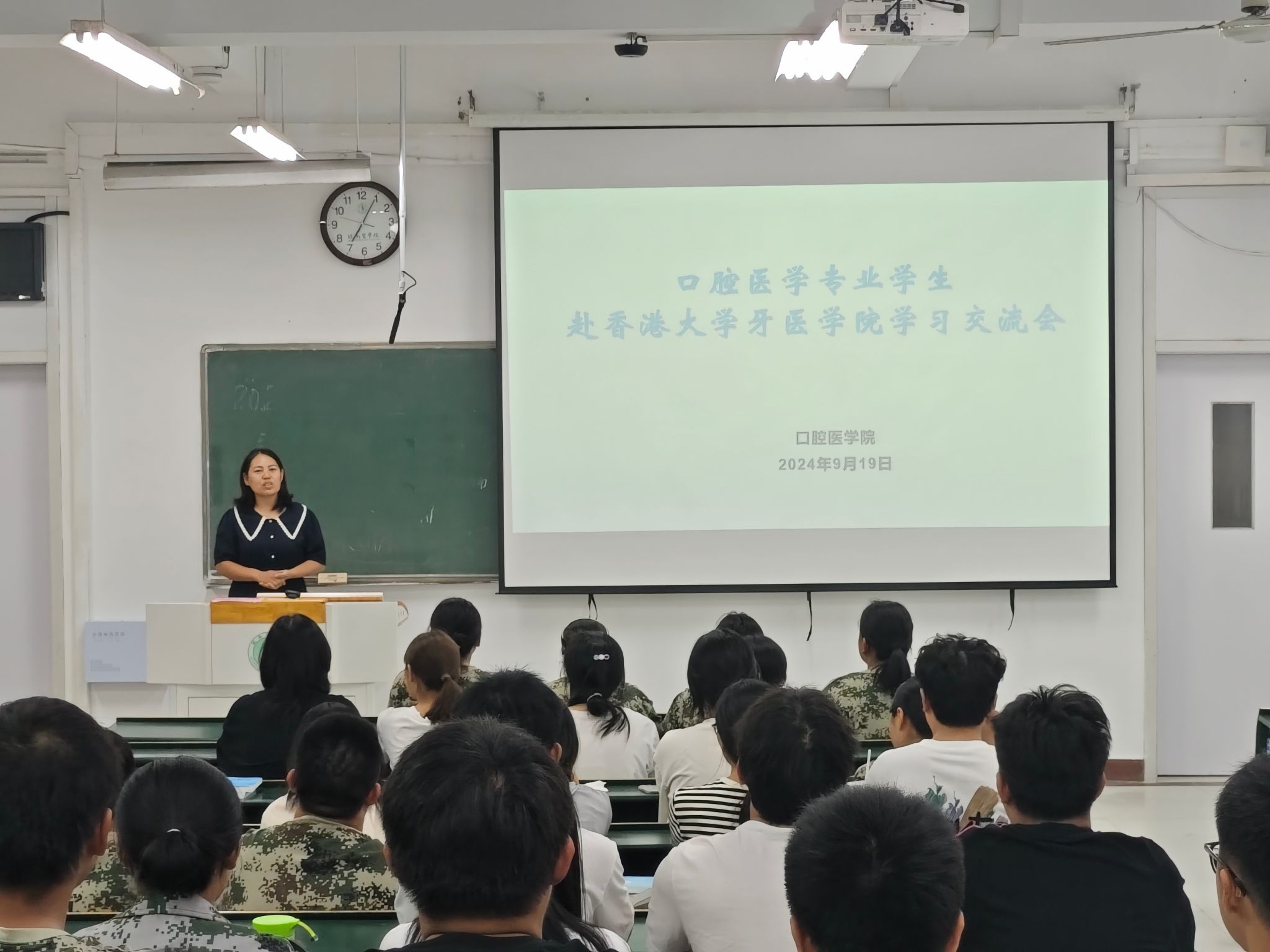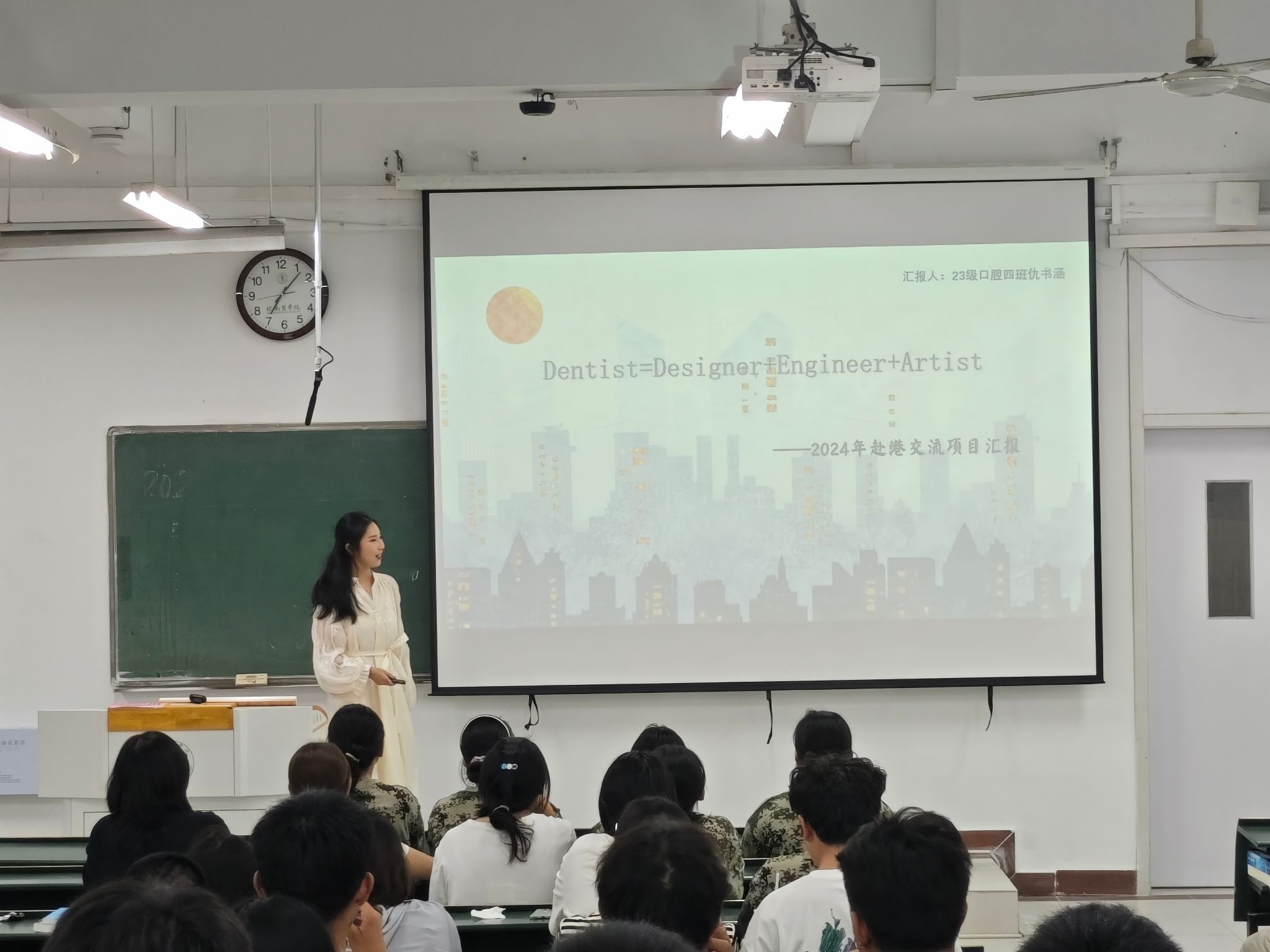 两位同学分别介绍了香港大学牙医公司的学习项目、口腔医学专业课程设置、学习课程安排,并重点就香港大学的教学理念、教学方式、全英文授课下的听课建议、全英文结业汇报与心得等方面内容进行了分享。两位同学表示,本次赴香港大学牙医公司学习交流,既学习了口腔医学领域前沿知识,感受到不同文化的熏陶,开拓了自己的视野,结识了许多志同道合的朋友,同时也认识到了自身在英语学习、口语表达、专业思辨等方面的不足。两位同学建议2024级新同学们在日常学习中应有广度、深度和内容新度,形成并保持良好的学习习惯,拓展思维、坚守医德、知行合一,在学有余力的情况下积极参加科研相关活动,尽早制定明晰的职业规划。