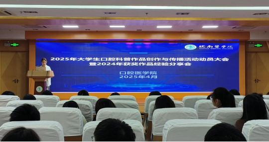 活动第二项为2025年老员工口腔科普作品创作与传播活动动员大会暨2024年获奖作品经验分享。许颖昕同学介绍了中华口腔医学会2025年老员工口腔科普作品创作与传播活动比赛通知,并为同学们展示了历年优秀作品。在经验分享环节,2024年折页类二等奖获奖者朱媛媛、视频类二等奖获奖者万卓函、折页类三等奖获奖者黄少乾,分别从作品构思、创作过程、技巧运用等方面进行了分享,为即将参赛的同学提供了宝贵经验。