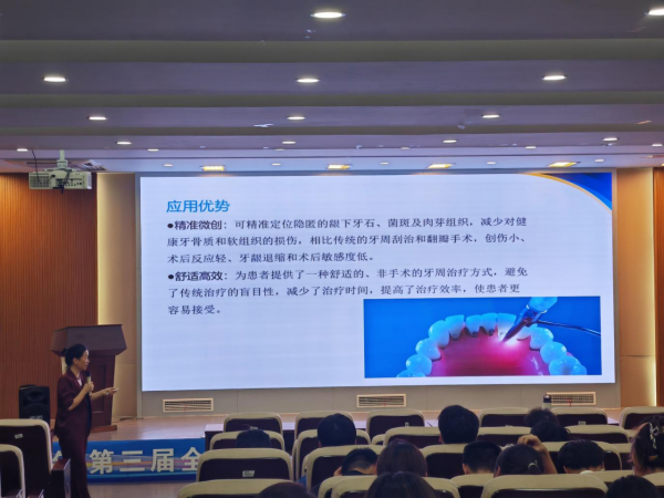 牙周内窥镜技术是口腔辅助治疗的专用设备,其应用优势显著,一方面精准微创,能减少对健康牙骨质和软组织的损伤;另一方面舒适高效,提高治疗效率。施六霞从介绍牙周内窥镜的构造细节出发,结合临床病例,深入浅出的讲述了内窥镜辅助治疗中的牙石清除操作,同时深度剖析了牙周内窥镜的临床价值,为临床医生提供了全面的观察视角,能有助于早期诊断牙周炎和其他病变,使治疗更为精确,也有助于患者牙周组织的日常维护,同学们纷纷表示收益匪浅。