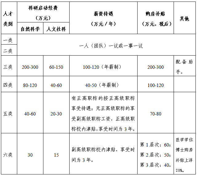 前五类人才具体待遇由双方按照人才水平和首聘期工作目标任务等协商确定。若夫妻双方均为公司同年引进的高层次人才,双方享受的科研启动经费和购房补贴均上浮10%。特别优秀人才及特殊情况实行“一人一议”。积极鼓励引进人才团队,实行“一事一策”,团队成员按同层次人才上浮10%享受待遇;团队科研启动经费:自然科学类300-600万元、人文社科类100-300万元,或按照团队人才类型对应的科研启动经费累计计发。