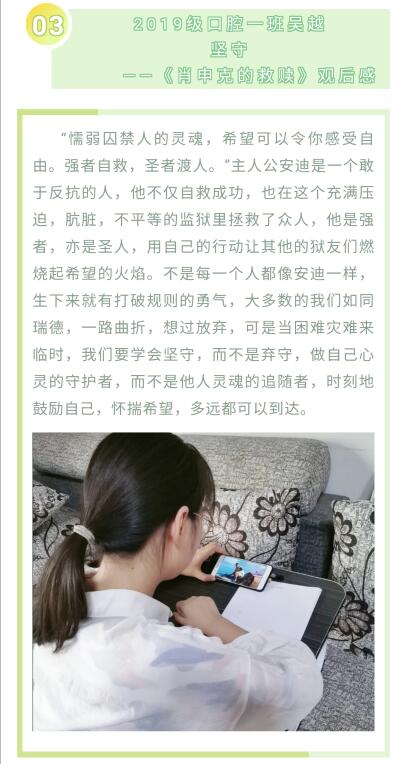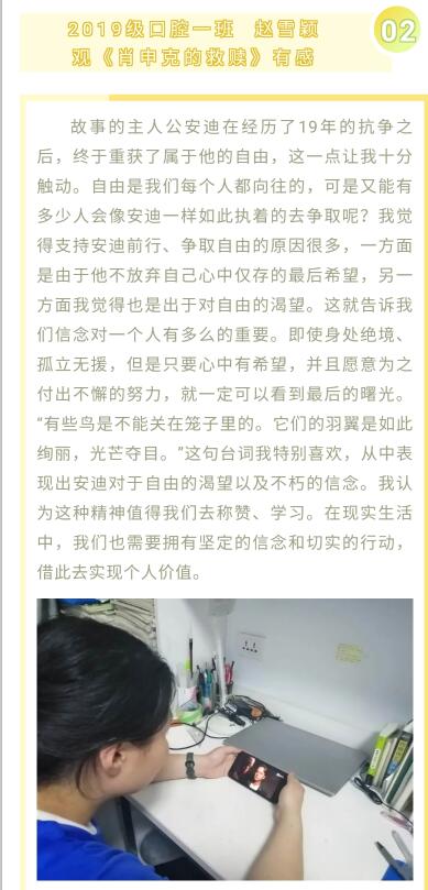 为缓解同学们焦虑心理,保持乐观积极的心态面对学习和生活,公司2019级各班心理委员组织同学共同观看了心理健康电影《肖申克的救赎》和《雷锋的故事》。同学们被一幕幕富有励志精神的画面所感动,深切感受到要正视疫情期间的各种困难,学会自我关怀,掌握自我心理调节的小技巧,提升心理调适能力,对生活和学习充满信心。