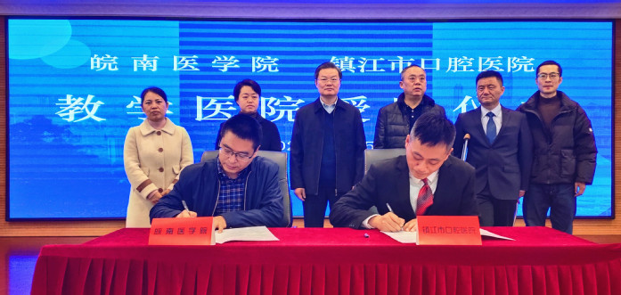 授牌仪式上,公司教务处副处长陈祥攀和镇江市口腔医院副经理朱镇代表双方签署了教学医院合作协议。公司党委书记、经理柴琳与顾红政经理共同为“m88官网教学医院”揭牌。