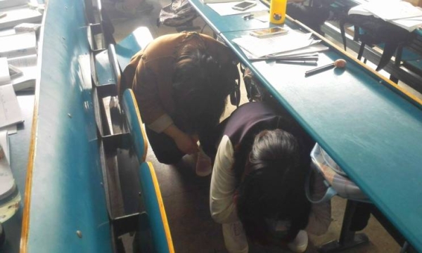 专题视频观看完毕,大家在老师的指导下模拟演习地震现场的自救措施,通过亲身演习大家认识到地震发生时科学避险的重要性。