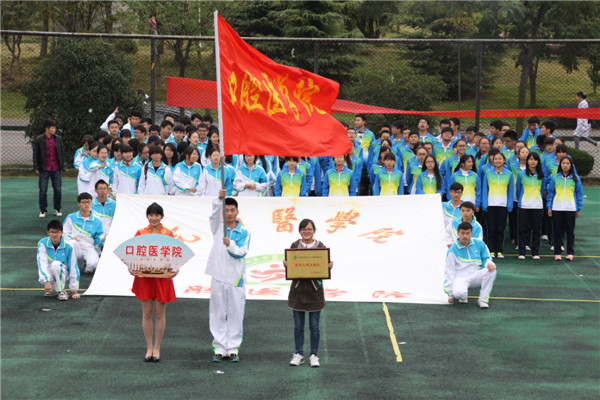 “口腔,加油”,观礼台上的拉拉队的声势似乎比赛场上还要激烈。简单的四个字在此时此刻是那么令人热血奔腾。鼓手,锣手,沉亮结合,谁又能不心潮澎湃?尽管天有小雨,但观众席定不会缺人,同学们为选手加油,这是我们m88的骄傲。