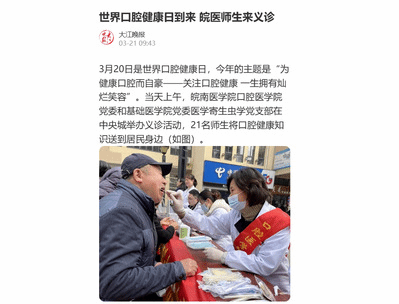 3月20日是世界口腔健康日,今年口腔健康日的主题是“为健康口腔而自豪--关注口腔健康 一生拥有灿烂笑容”。当日上午,在公司党委教工党支部书记施六霞、员工第三党支部书记张晋艳带领下,师生来到中央城社区开展志愿服务活动。本次活动围绕血压测量、口腔检查以及改良巴氏刷牙法宣传等内容展开。活动中,员工党员们为居民进行血压测量、改良巴氏刷牙法的宣教,现场发放世界口腔健康日宣传单进行口腔保健知识宣传并耐心解答相关问题。王云、施六霞、万媛等教师党员为居民进行了口腔健康检查,及时回应居民提出的口腔保健方面的问题,对患有口腔疾病的居民提出治疗方案和就诊建议。