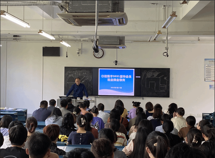 李康才从当前毕业生规模、就业岗位数量、就业需求、岗位条件等方面,为同学们分析了当前的就业形势,分析了当前应届毕业生就业中存在的问题和难点。他表示,2023年毕业规模将超过1150万人,就业压力极大,所有的同学要认清就业形势,着眼各类就业渠道,积极响应毕业生入伍、西部计划、三支一扶计划等。他还教育广大同学珍惜毕业后一年时间,在工作中不断学习,积累经验,为后续执业医团队格考试尽早打下基础。