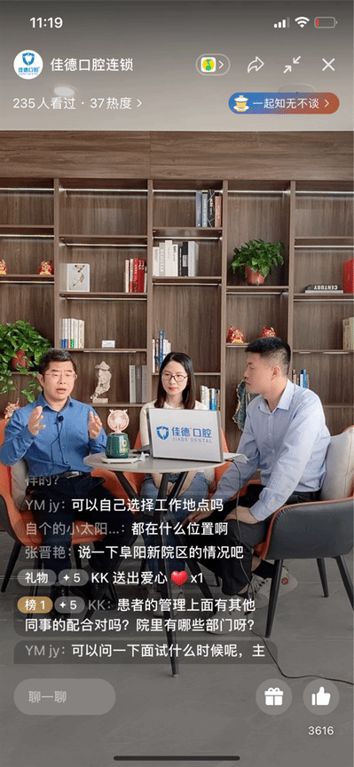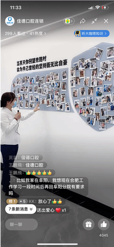招聘会上,朱文顺从发展历程、企业规模、用人需求、福利待遇等方面向与会人员进行了详细的介绍,王凯和胡亚萍分别以嘉宾的身份,通过与主持人互动问答的形式巧妙地介绍了新入职医员工需做的准备、医患沟通等职业发展相关内容,并就阜阳佳德口腔新院情况、进院后的医生培养等方面与参会员工进行了互动交流,现场气氛非常活跃。随后,在庐阳分院工作人员的带领下,参会人员在线上参观了佳德口腔庐阳分院。医院优美的环境、精心的布局、先进的设备,给毕业生留下了非常深刻的印象。招聘会受到了员工们的好评,已有多名员工与医院达成就业意向。