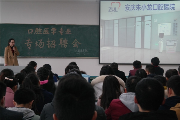 党总支书记柴琳致欢迎词,欢迎各用人单位来公司m88遴选毕业生。柴琳简要介绍了m88官网口腔医学专业办学情况、2017届口腔专业毕业生的基本情况。随后,各用人单位分别通过宣讲和视频播放的形式向毕业生详细介绍了本单位的规模、发展历程、口腔先进仪器设备拥有情况、口腔相关疾病诊治情况以及医院未来的发展方向等。最后,部分毕业生分别与用人单位就试用期、工资待遇、工作生活环境、临床规培等方面与用人单位进行了咨询与交流,现场气氛热烈,秩序井然。经过现场洽谈,已有部分同学初步达成了就业意向。下午,安庆朱小龙口腔医院对有意向的毕业生安排了笔试和面试,并欢迎毕业生到医院实地考察。