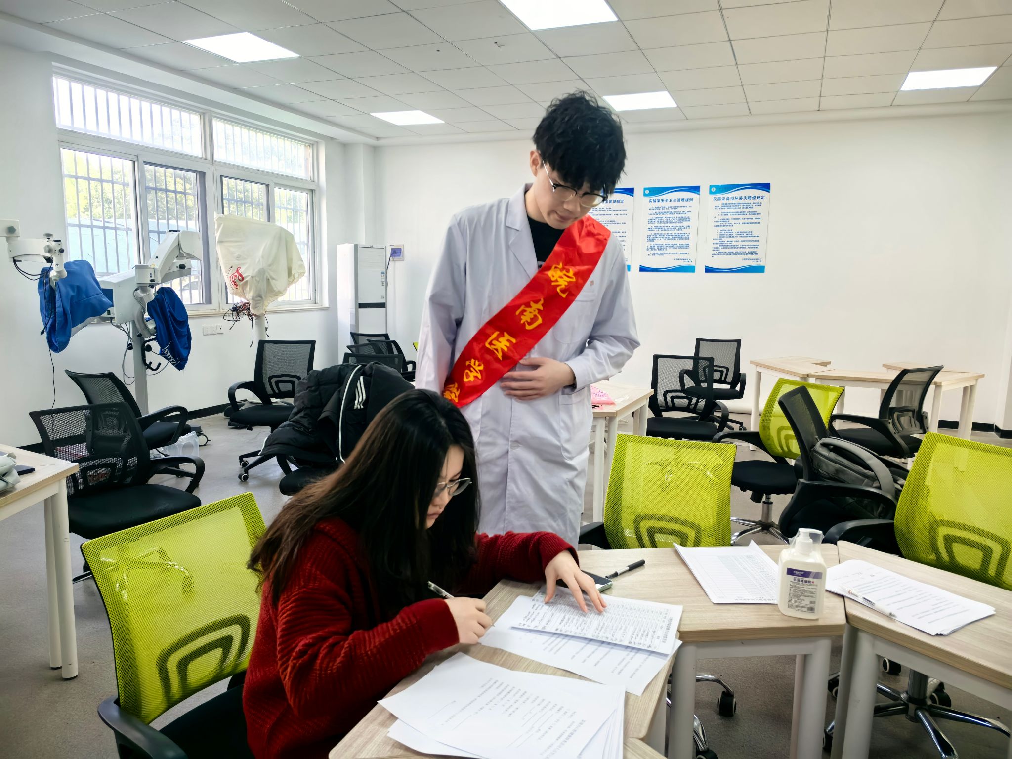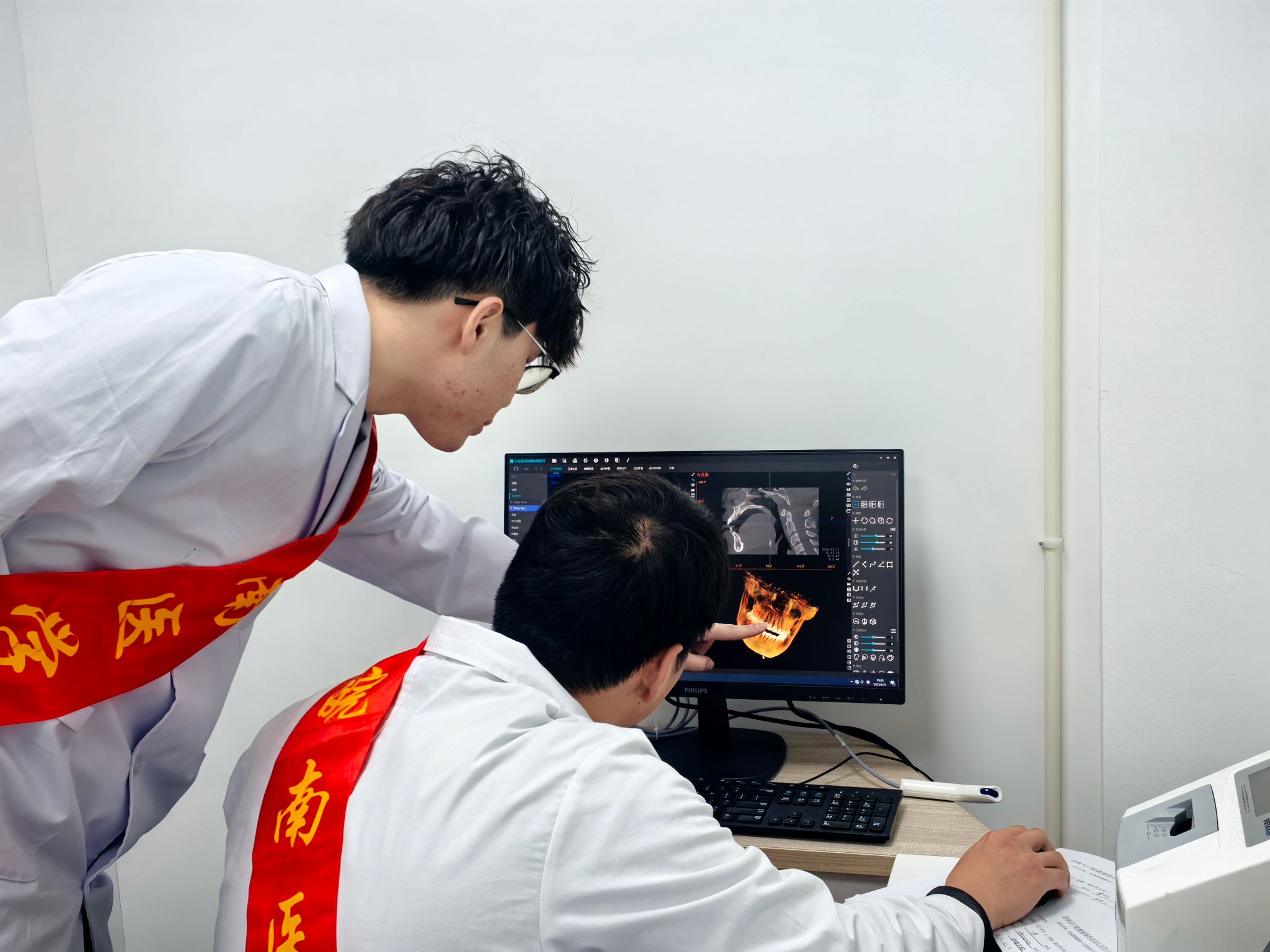实践育人:志愿服务锤炼临床技能。本次雷锋月活动将课堂搬进服务现场,2021级、2022级志愿者全程参与影像拍摄与报告解读。志愿者严格执行防护标准,引导参与者完成曲面断层扫描定位,精准调整设备参数,展现扎实的影像采集能力。通过拍摄前病史询问、影像质量控制分析,员工学会将理论知识与临床表征结合,如通过根尖片判断牙周炎进展,利用CBCT评估颌骨囊肿范围等。志愿者还细致讲解备孕辐射防护注意事项,体现了医者仁心。