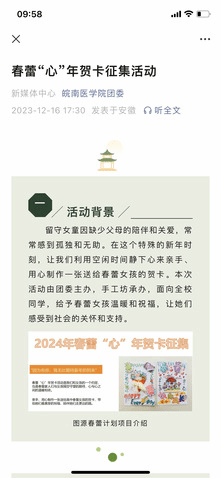 本次活动由校团委联合芜湖市千帆助学公益中心联合开展,手工坊社团承办。据悉,“春蕾女孩”是中国儿童少年基金会发起“春蕾计划”公益项目资助的贫困家庭女孩。活动前期,手工坊社团积极筹备,在校团委微信公号发布推文,深入发动、广泛宣传活动,倡导青年员工积极参与,通过手工制作贺卡的形式,为春蕾女孩送上新年祝福。